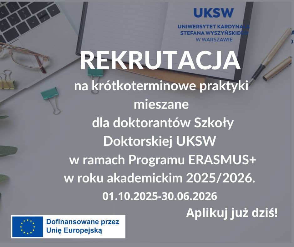 Rozpoczynamy rekrutację na krótkoterminowe praktyki mieszane Erasmus+ dla doktorantów Szkoły Doktorskiej Uniwersytetu Kardynała Stefana Wyszyńskiego w Warszawie – to pierwsza taka edycja na naszej uczelni!