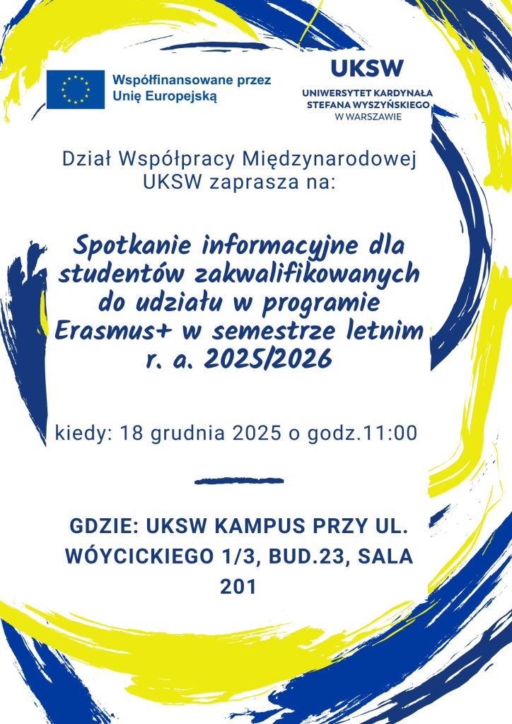 Dział Współpracy Międzynarodowej UKSW serdecznie zaprasza wszystkich zakwalifikowanych studentów do udziału w programie Erasmus+ w semestrze letnim roku akademickiego 2025/2026 na spotkanie informacyjne.
