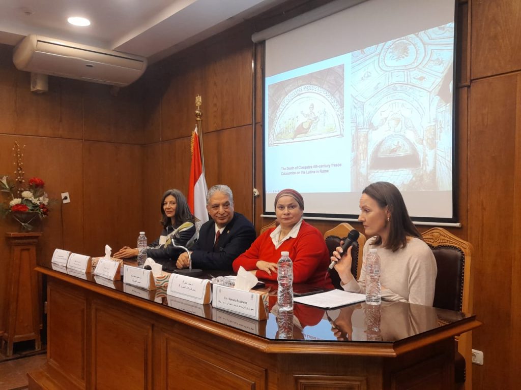 W dniach 18–22 stycznia 2026 r. odbyłam mobilność dydaktyczną w ramach programu Erasmus+KA171 (Staff Mobility for Teaching) na Uniwersytecie Kairskim (Cairo University), Wydział Archeologii. Mobilność trwała 5 dni, podczas których przeprowadziłam 8 godzin zajęć dydaktycznych w języku angielskim dla grupy około 40 studentów. Zajęcia obejmowały następujące tematy: „Acheiropoietos Images – ‘Not Made by Human Hands’”, „Passion of Christ in Art. Places, Buildings, and Representations of Passion”, „Relics of the Saints: Typology and Iconography” oraz „Christian Cemeteries and Sepulchral Art”.