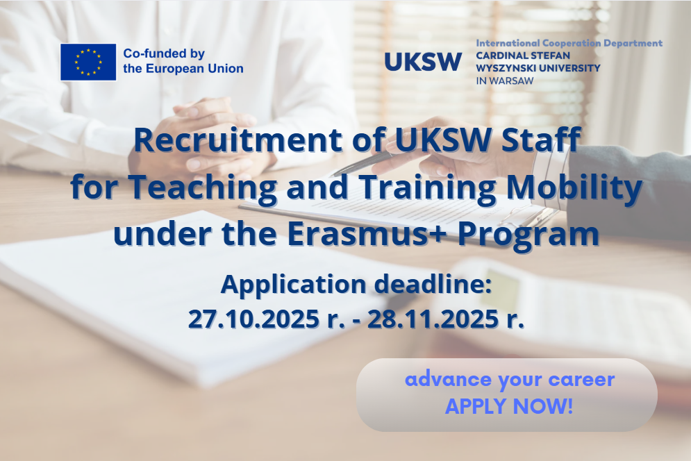 We are pleased to inform you that recruitment for staff at Cardinal Stefan Wyszynski University for mobilities under the Erasmus+ KA131 program will be open from October 27, 2025, to November 28, 2025.